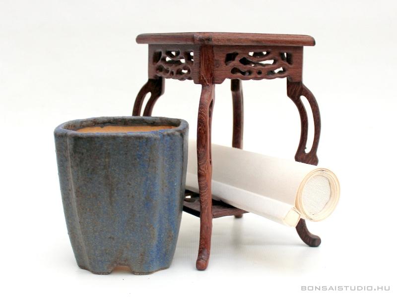 Bonsai kiegészítő szett, mely a beltéri bonsaiok lakásban történő esztétikus elhelyezéséhez vagy bonsai kiállításra felkészítésére használható. A szett tartalmaz egy egyedi kék mázas bonsai tálat (10 x 10 x 11cm), egy bonsai asztalt (11,5 x 11,5 x 17,5cm) és egy kiakasztható tekercsképet (100 x 23cm).
