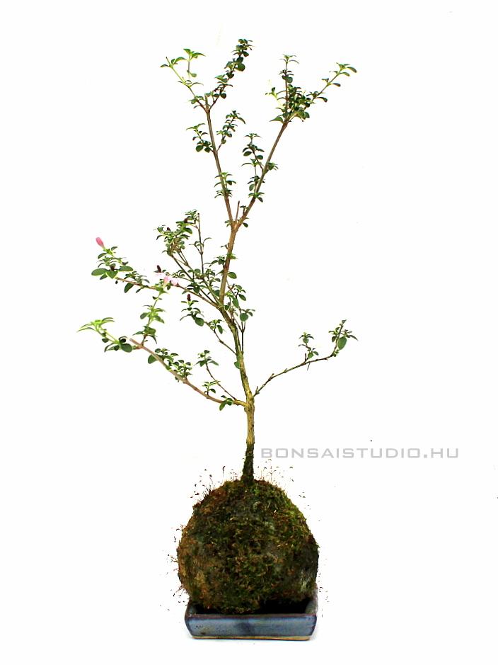 Serissa foetida 'Variegata' kokedama, mely keto és akadama keverékébe ültetve él. Gömb alakú földlabdáját moha borítja, mely nem csak gátolja a kiszáradást, de zöld színével kellemes színharmóniáát alkot a növény többi részével. A kokedama alátétje visszafogott kékes színével minden fölösleges hivalkodástól mentesíti a látványt.