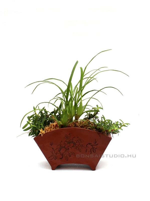 Ornithophora radicans és Mediocalcar pygmea orchideákból összeültetett kusamono kompozíció. Míg az Ornithophora a világoszöld, hosszúkás leveleivel és pici bulbáival díszítő orchidea, addig a Mediocalcar apró sötétzöld leveleivel és narancsárga virágaival díszít. A tál színével kellemes harmóniát alkot mindkét növény virágzata. Üde hangsúlyozó eleme lehet egy - egy bonsainak kiállítási egységnek. Önálló növényként, shitakusa - ként is megállja a helyét. Lakásban télen nyáron egyaránt könnyen tartható.