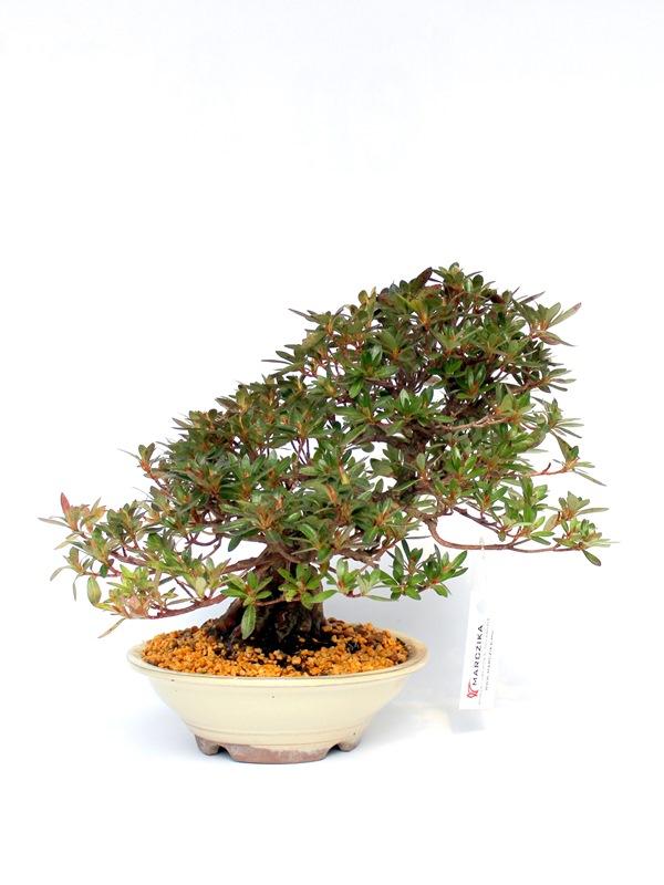 21 cm-es 'Osakazuki' nevű Rhododendron indicum bézs tálban. Shohin kiállításra (kifejezetten a hasonlóan kisméretű bonsai-ok megmérettetése) abszolút esélyes. Gyönyörű a törzse, élénk rózsaszín virágokat hoz.